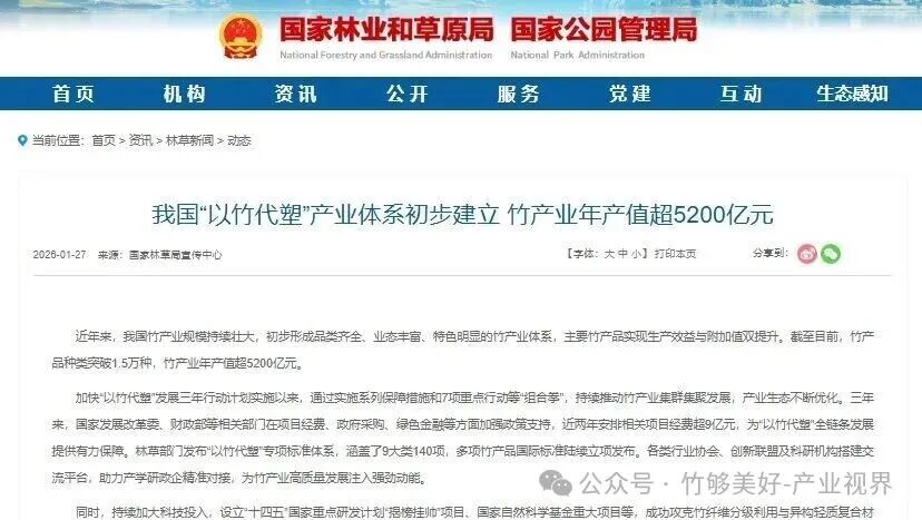 1月27日,国家林草局发布了一条振奋人心的消息:我国竹产业年产值已突破5200亿元,竹产品种类超过1.5万种,“以竹代塑”产业体系初步建立。