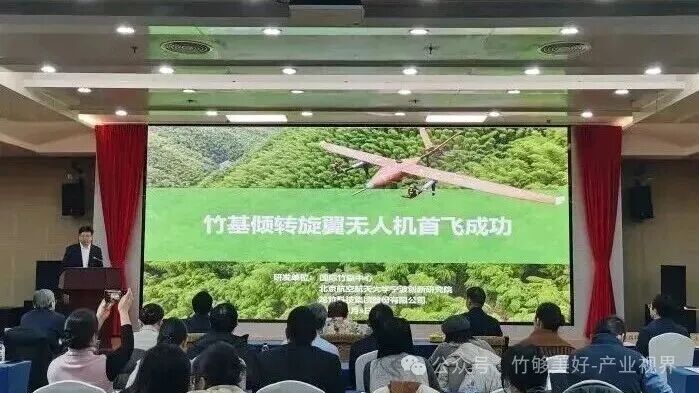 由国际竹藤中心、北京航空航天大学等单位联合研发的全球首款竹基复合材料倾转旋翼无人机成功首飞。